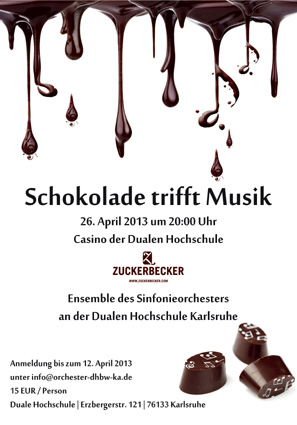 In diesem Sinne gibt Axel Becker sein Fachwissen zwischen fermentierter Kakaobohne und 100%-er Schokolade unter anderem in Seminaren weiter und bereist immer wieder selbst die Anbaugebiete für Kakao, Tee und Kaffee rund um die Welt. Auch an diesen Erfahrungen lässt er das Publikum am 26. April teilhaben. Der Schokoladenabend reiht sich nahtlos in die Tradition des Sinfonieorchesters an der Dualen Hochschule Karlsruhe ein. Die Konzertprogramme heben sich bewusst vom üblichen Mainstream ab und bringen immer wieder überraschende thematische Kombinationen auf die Bühne. Karten für den schokoladigen Frühlingsabend gibt es zu 15 Euro im Vorverkauf unter info@orchester-dhbw-ka.de. Weitere Informationen: http://www.dhbw-karlsruhe.de/allgemein/dhbw-karlsruhe/orchester/ Der Junge Kulturkanal präsentiert das Pralinenseminar vom ZUCKERBECKER:http://jungerkulturkanal.de/index.php?id=80&cid=959